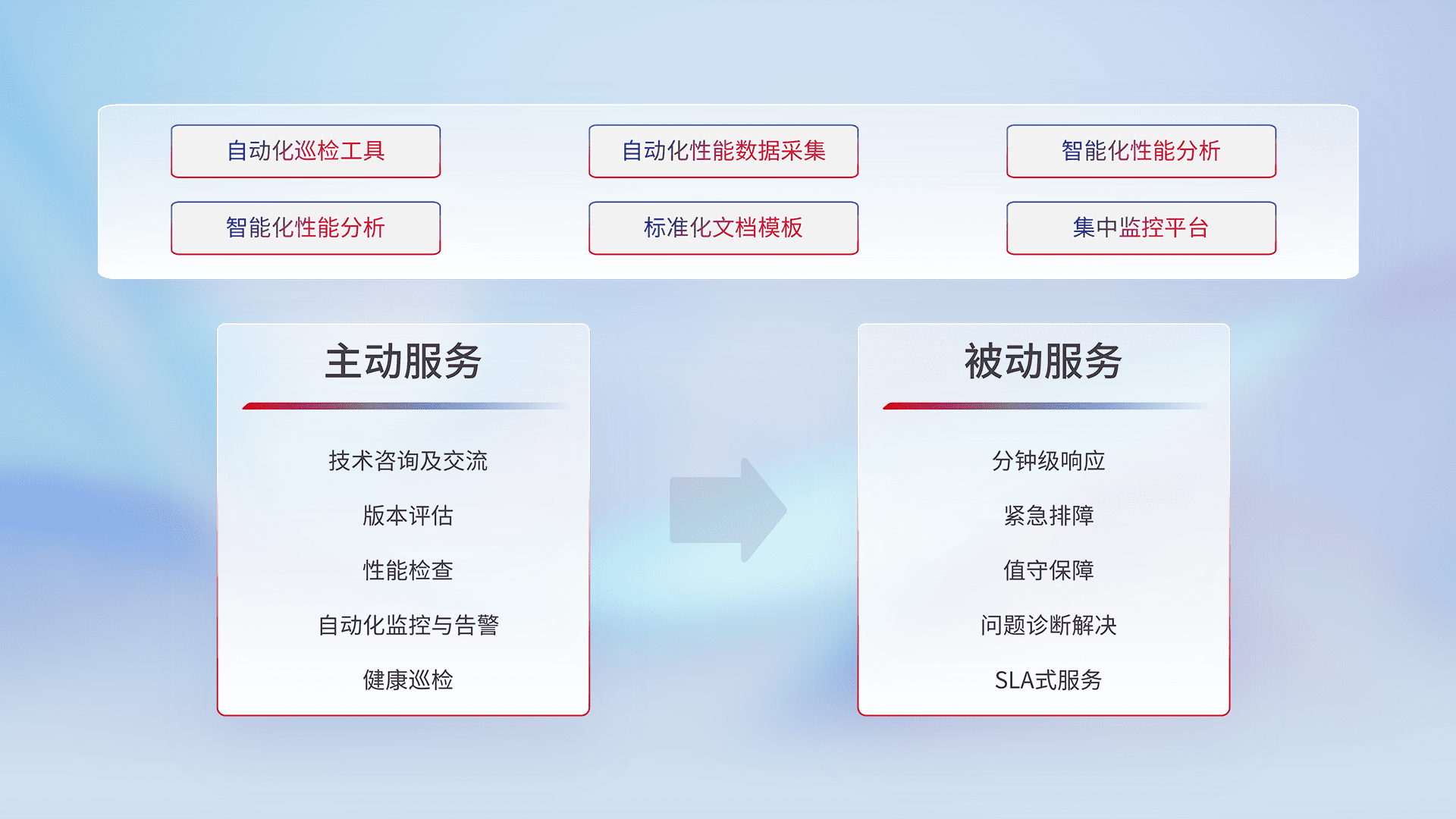 智能化工具和标准化文档,,保障服务质量,,,提供主动服务(包含技术咨询、、、版本评估、、、、性能检查、、自动化监控与告警、、、健康巡检)和被动服务包含(分钟级响应、、、紧急排障、、、、值守保障、、、问题诊断解决、、SLA服务)。。。。